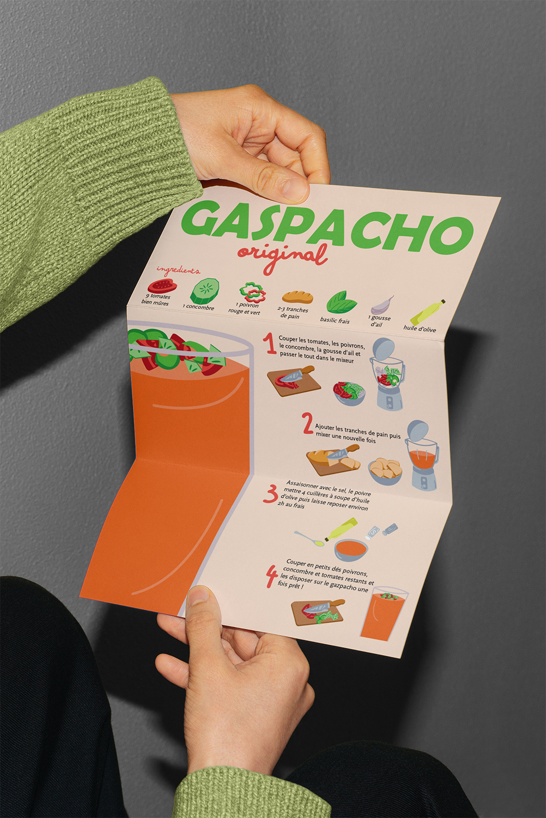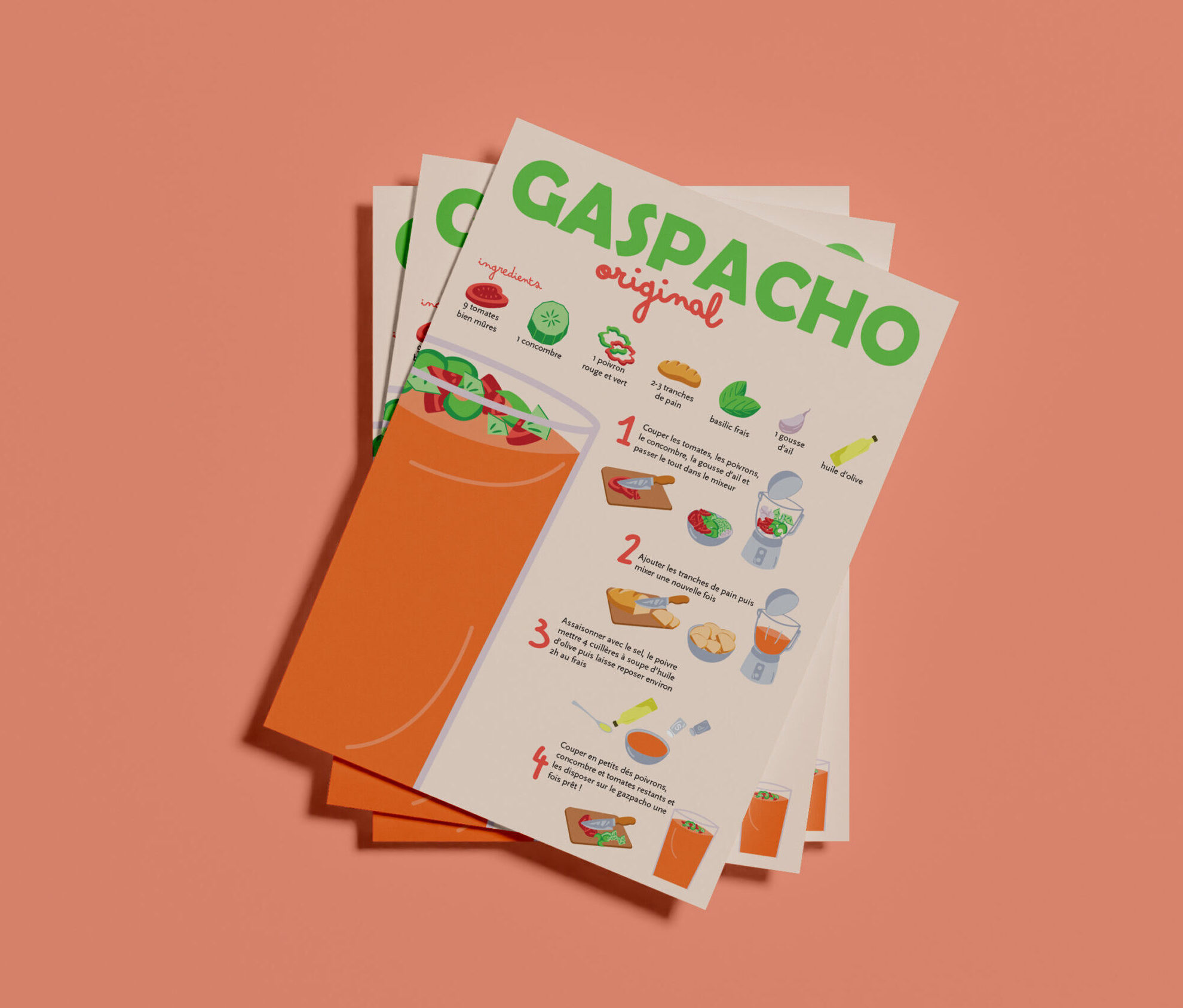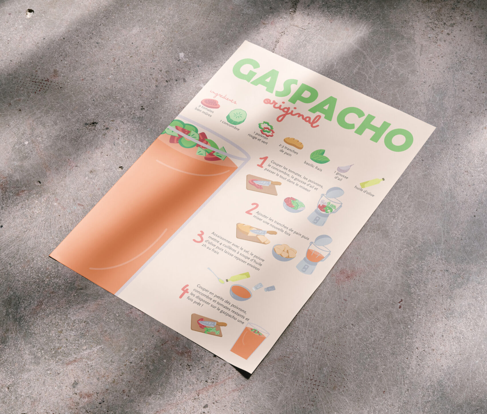 Création d’une affiche autour de la recette du gaspacho. L’objectif est de transmettre la recette de manière ludique et colorée, compréhensible par tous.